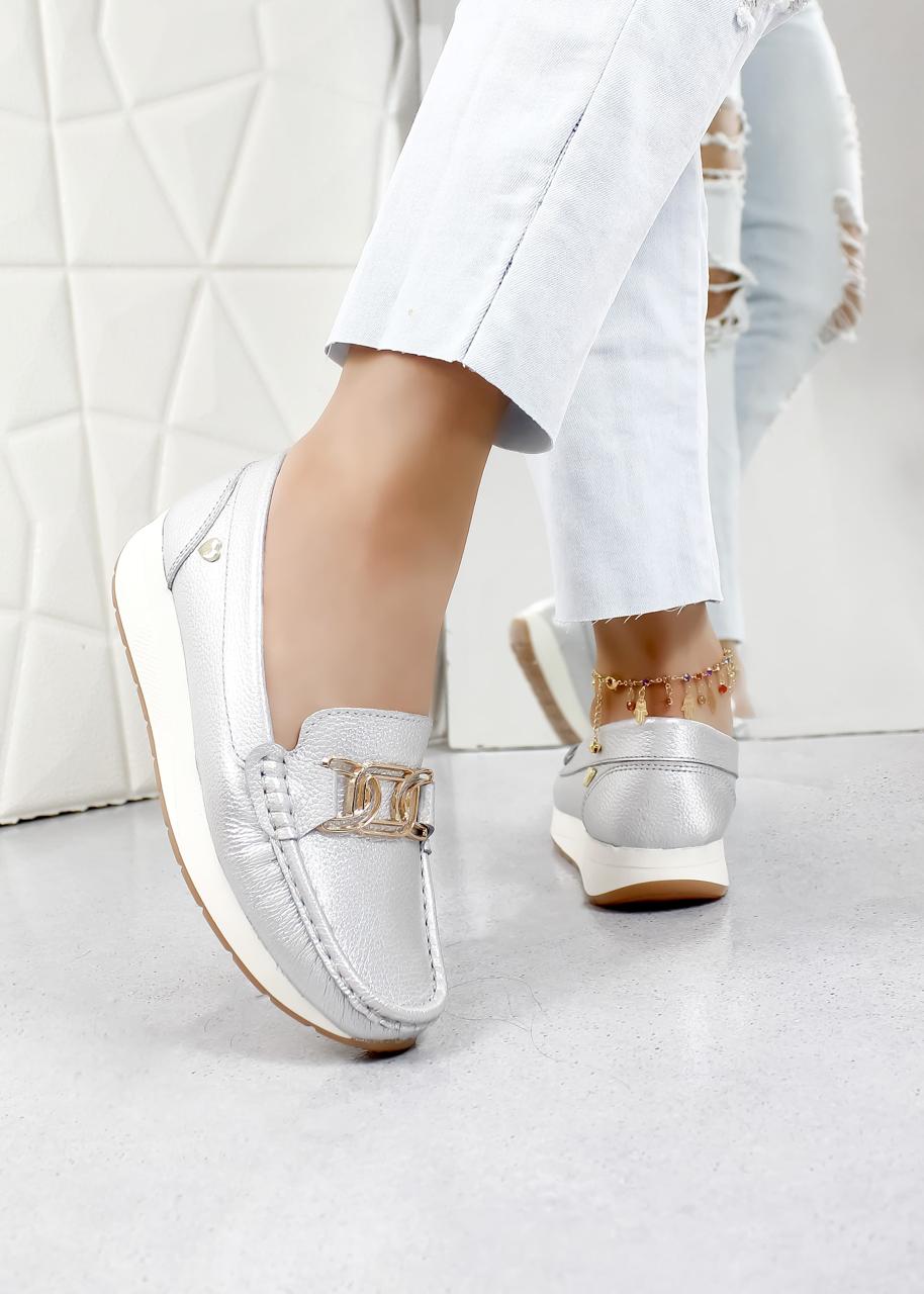 Este mocasín plateado combina la elegancia clásica con toques modernos y llamativos. Confeccionado en un cuero plateado brillante, este zapato irradia sofisticación y estilo.